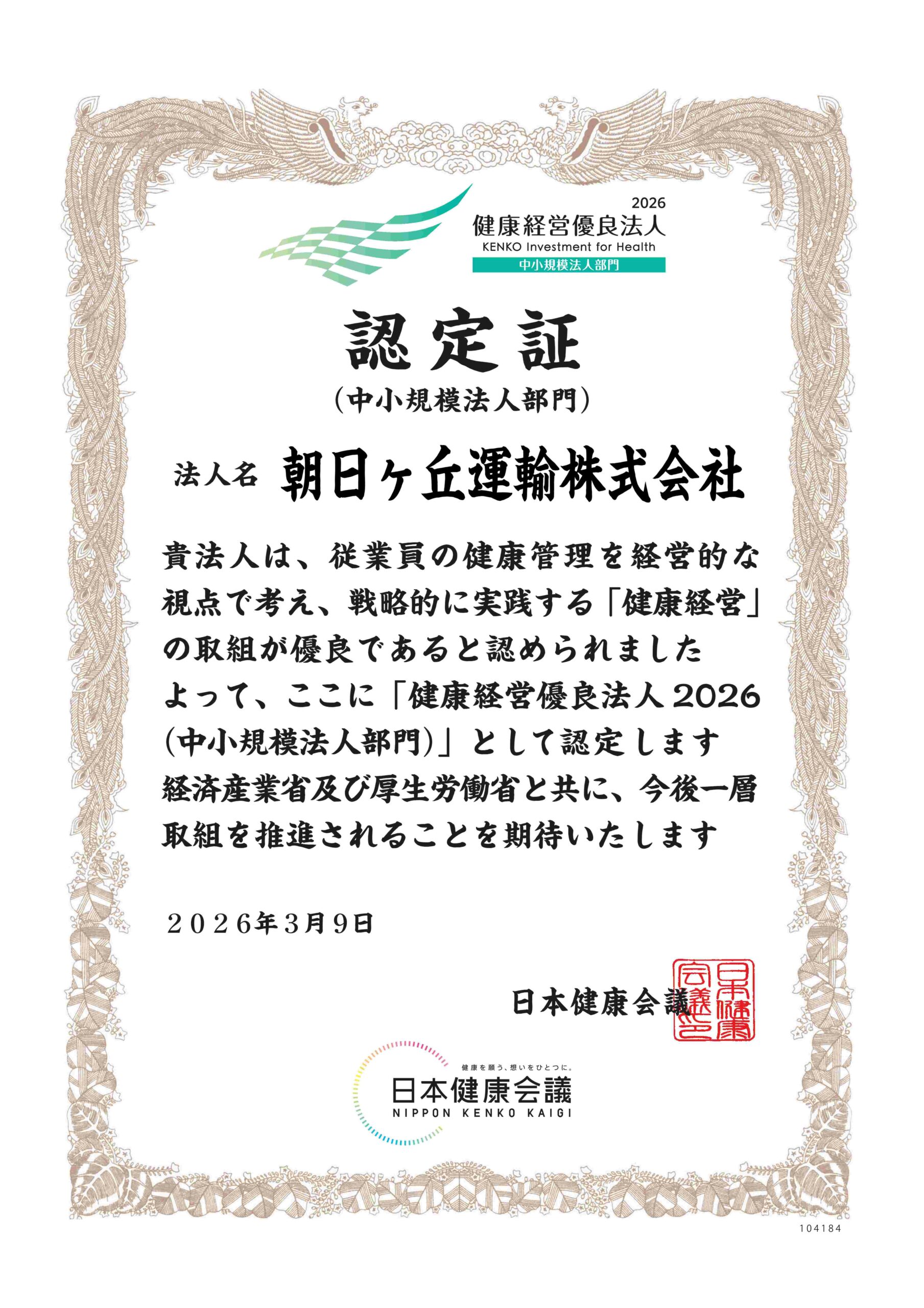新着情報 News 「健康経営優良法人2026(中小規模法人部門)」に認定されました 2026.4.1 朝日ヶ丘運輸 2026 2025 2024 2023 2022 2021 2020 朝日ヶ丘運輸 朝日ヶ丘グループ